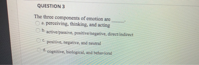 Solved Question 3 The Three Components Of Emotion Are A Chegg Com